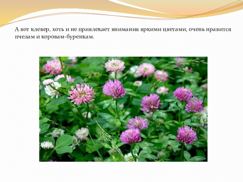 Слайд 7А вот клевер, хоть и не привлекает внимания яркими цветами, очень нравится