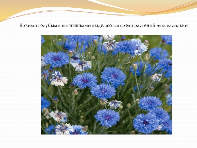 Слайд 6 Яркими голубыми пятнышками выделяются среди растений луга васильки.