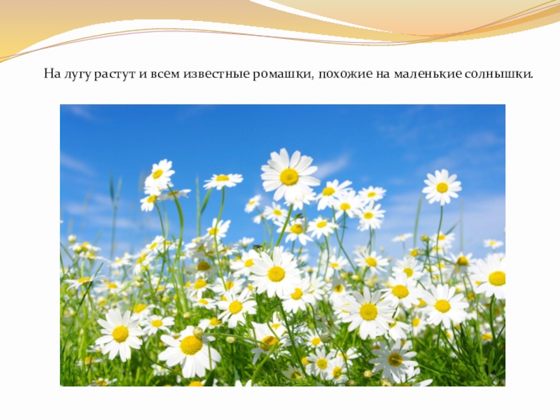 Слайд 5На лугу растут и всем известные ромашки, похожие на маленькие солнышки.