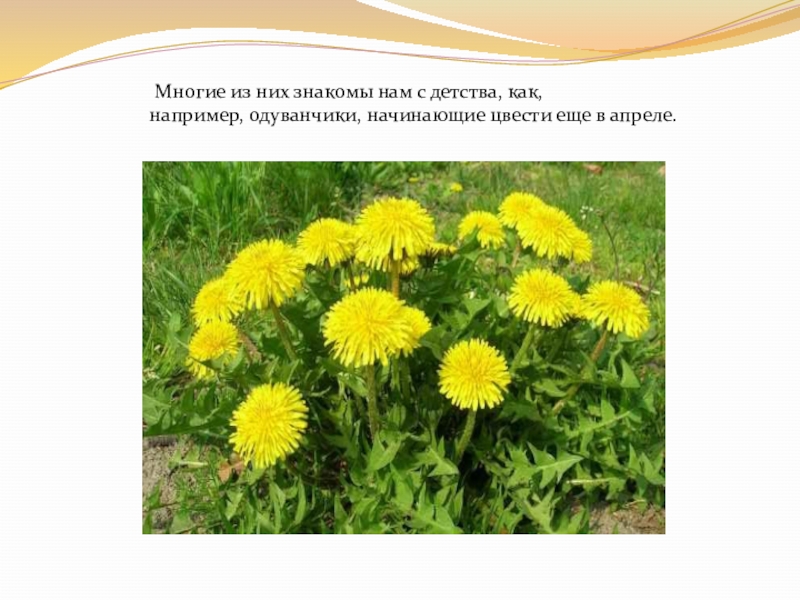 Слайд 4 Многие из них знакомы нам с детства, как, например, одуванчики, начинающие