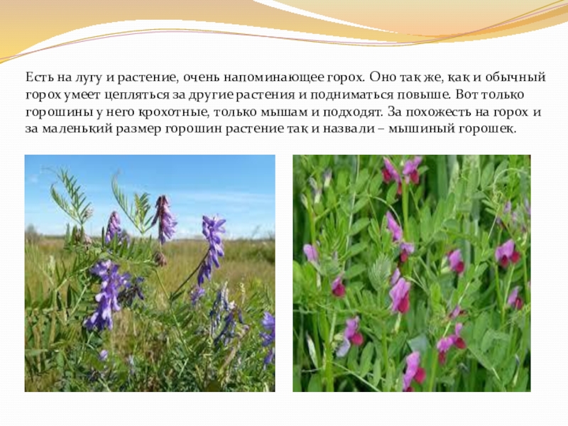 Слайд 13Есть на лугу и растение, очень напоминающее горох. Оно так же,