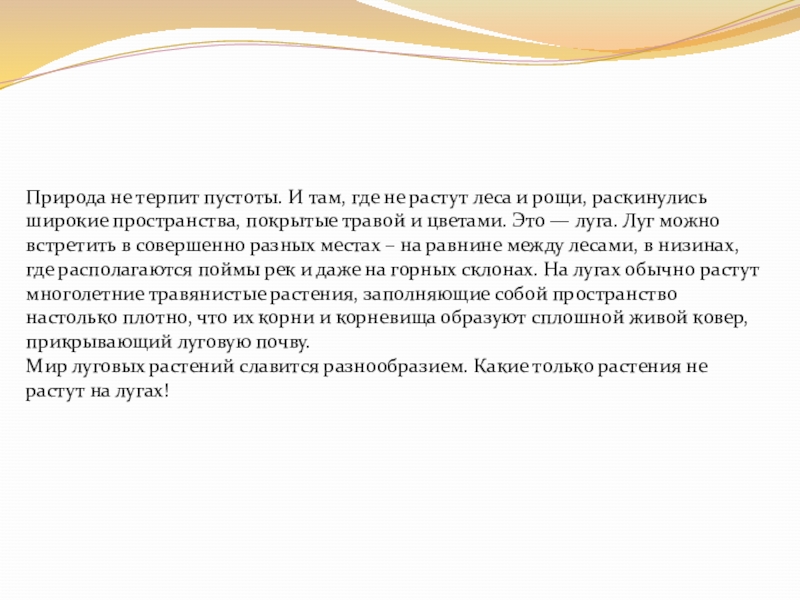 Природа не терпит пустоты. И там, где не растут леса и рощи, раскинулись широкие пространства, покрытые травой и цветами. Это — луга. Луг можно встретить в совершенно разных местах – на равнине между лесами, в низинах,