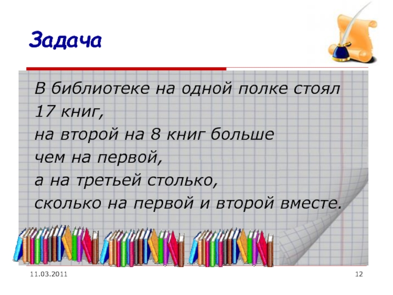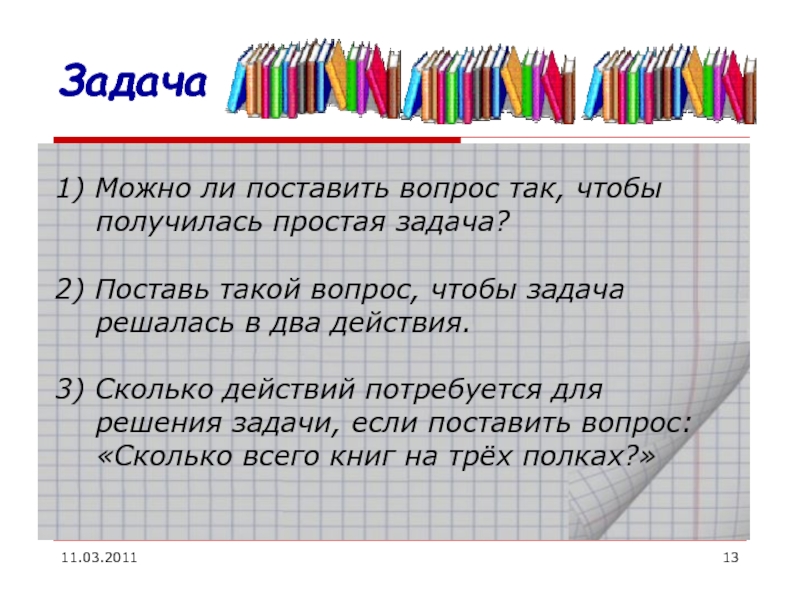 3) Сколько действий потребуется для решения задачи, если поставить вопрос: «Сколько всего книг на трёх полках?»