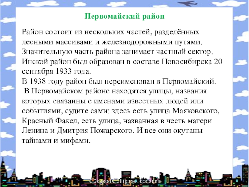 В Первомайском районе находятся улицы, названия которых связанны с именами известных людей или событиями, судите сами: здесь есть улица Маяковского, Красный Факел, есть улица, названная в честь матери Ленина и Дмитрия Пожарского. И все они окутаны тайнами и мифами.