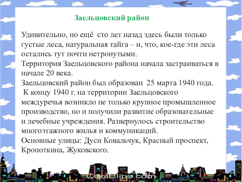 Территория Заельцовского района начала застраиваться в начале 20 века.