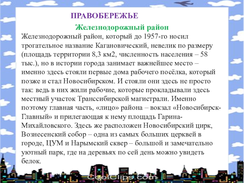 по размеру (площадь территории 8,3 км2, численность населения – 58 тыс.), но в истории города занимает важнейшее место – именно здесь стояли первые дома рабочего посёлка, который позже и стал Новосибирском. И стояли они здесь не просто так: ведь в них жили рабочие, которые прокладывали здесь местный участок Транссибирской магистрали. Именно поэтому главная часть, «лицо» района – вокзал «Новосибирск-Главный» и прилегающая к нему площадь Гарина-Михайловского. Здесь же расположен Новосибирский цирк, Вознесенский собор – одна из самых больших церквей в городе, ЦУМ и Нарымский сквер – большой и замечательно уютный парк, где на деревьях по сей день можно увидеть белок.