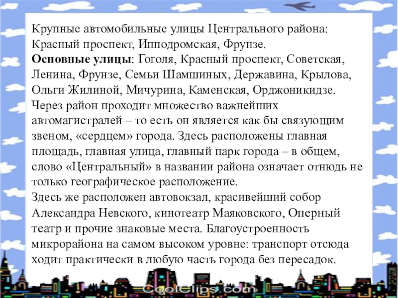 Через район проходит множество важнейших автомагистралей – то есть он является как бы связующим звеном, «сердцем» города. Здесь расположены главная площадь, главная улица, главный парк города – в общем, слово «Центральный» в названии района означает отнюдь не только географическое расположение.