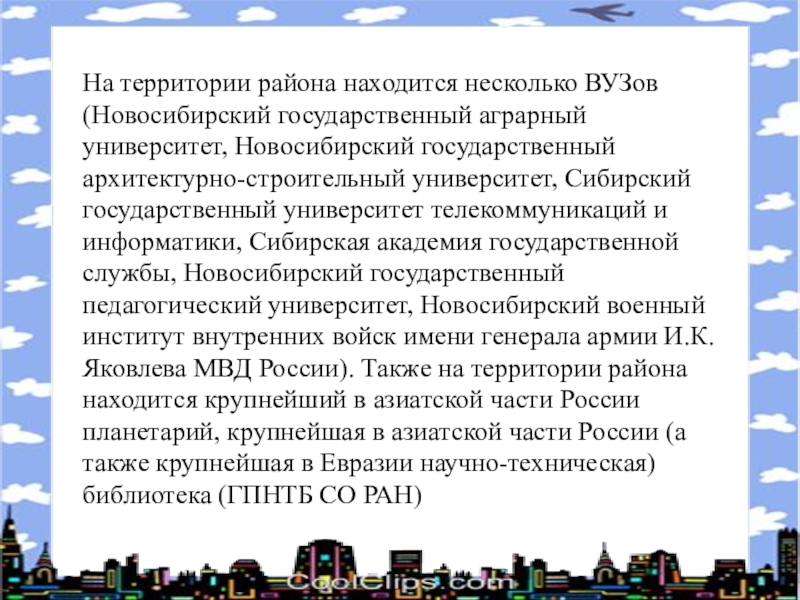 Слайд 17На территории района находится несколько ВУЗов (Новосибирский государственный аграрный университет, Новосибирский
