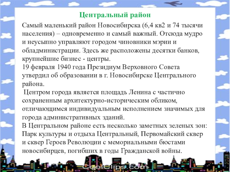 19 февраля 1940 года на карте Новосибирска вновь появился Центральный район. Историю забывать нельзя. Отсюда начиналось развитие нашего города — первый храм, первый банк, первая электростанция, радиостанция, первый стадион…