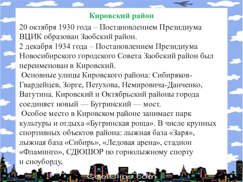 2 декабря 1934 года – Постановлением Президиума Новосибирского городского Совета Заобский район был переименован в Кировский.