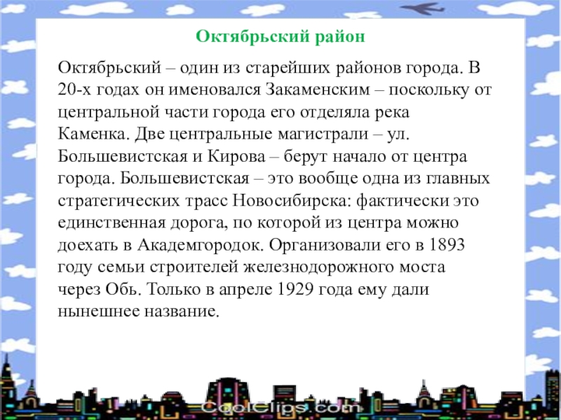 он именовался Закаменским – поскольку от центральной части города его отделяла река Каменка. Две центральные магистрали – ул. Большевистская и Кирова – берут начало от центра города. Большевистская – это вообще одна из главных стратегических трасс Новосибирска: фактически это единственная дорога, по которой из центра можно доехать в Академгородок. Организовали его в 1893 году семьи строителей железнодорожного моста через Обь. Только в апреле 1929 года ему дали нынешнее название.