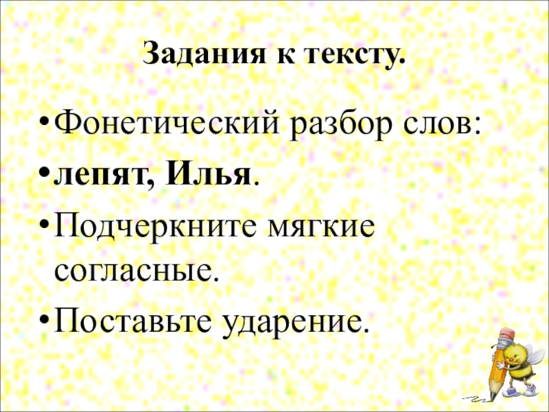 Задания к тексту.Фонетический разбор слов: лепят, Илья.Подчеркните мягкие согласные. Поставьте ударение.