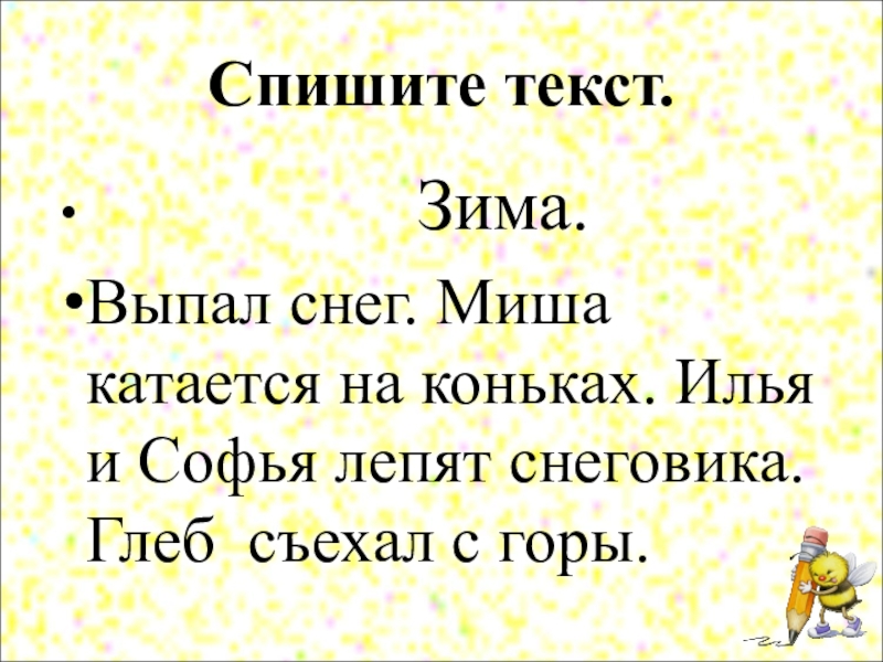 Выпал снег. Миша катается на коньках. Илья и Софья лепят снеговика. Глеб съехал с горы.