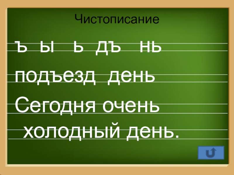 Чистописаниеъ ы  ь дъ  ньподъезд деньСегодня очень холодный день.