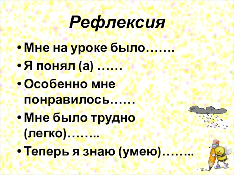РефлексияМне на уроке было…….Я понял (а) ……Особенно мне понравилось……Мне было трудно(легко)……..Теперь я знаю (умею)……..