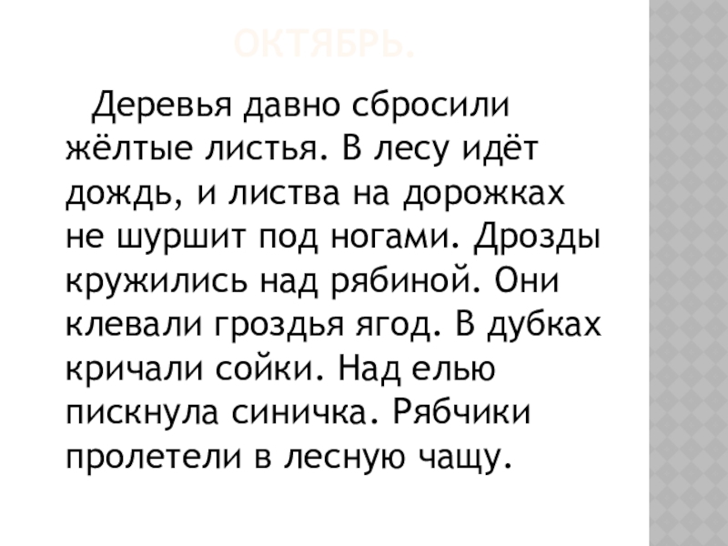 дождь, и листва на дорожках не шуршит под ногами. Дрозды кружились над рябиной. Они клевали гроздья ягод. В дубках кричали сойки. Над елью пискнула синичка. Рябчики пролетели в лесную чащу.
