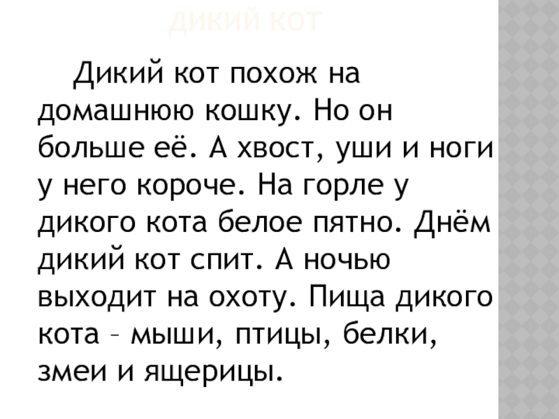 Но он больше её. А хвост, уши и ноги у него короче. На горле у дикого кота белое пятно. Днём дикий кот спит. А ночью выходит на охоту. Пища дикого кота – мыши, птицы, белки, змеи и ящерицы.