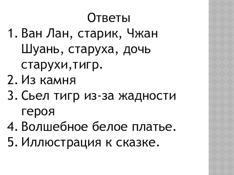 Ван Лан, старик, Чжан Шуань, старуха, дочь старухи,тигр.