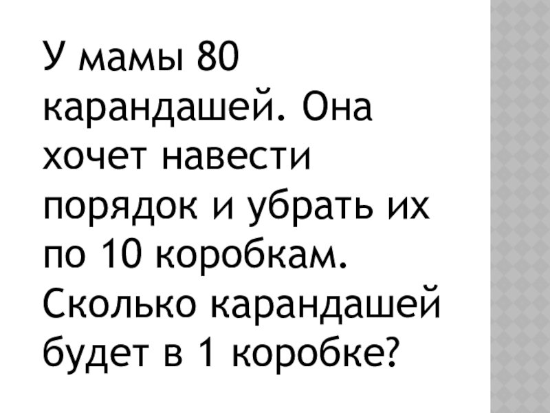 Слайд 44У мамы 80 карандашей. Она хочет навести порядок и убрать их