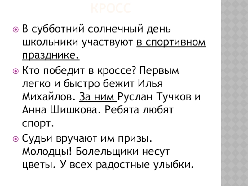 кроссе? Первым легко и быстро бежит Илья Михайлов. За ним Руслан Тучков и Анна Шишкова. Ребята любят спорт.
