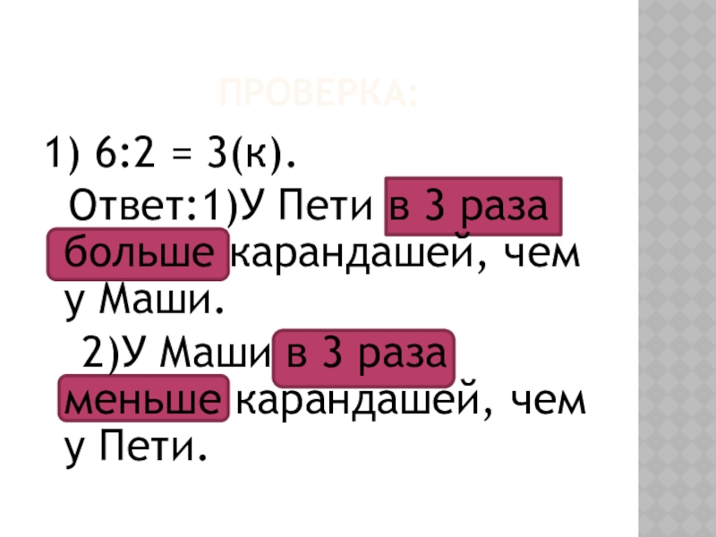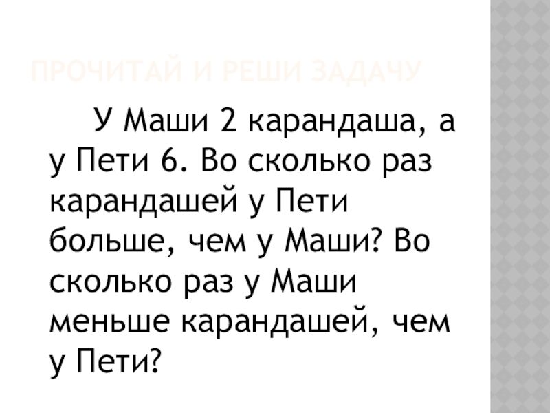 у Пети 6. Во сколько раз карандашей у Пети больше, чем у Маши? Во сколько раз у Маши меньше карандашей, чем у Пети?