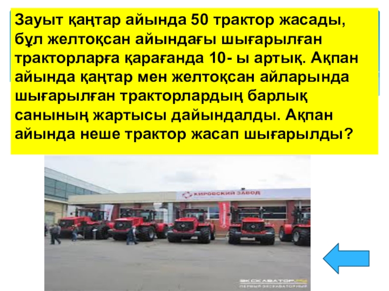 Слайд 9Зауыт қаңтар айында 50 трактор жасады, бұл желтоқсан айындағы шығарылған тракторларға
