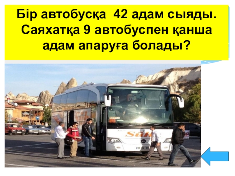 Слайд 10Бір автобусқа 42 адам сыяды. Саяхатқа 9 автобуспен қанша адам апаруға