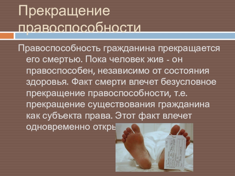 правоспособен, независимо от состояния здоровья. Факт смерти влечет безусловное прекращение правоспособности, т.е. прекращение существования гражданина как субъекта права. Этот факт влечет одновременно открытие наследства.