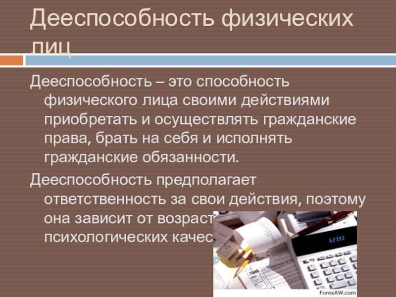Дееспособность предполагает ответственность за свои действия, поэтому она зависит от возраста, физических и психологических качеств личности.