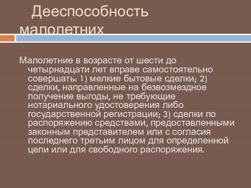 вправе самостоятельно совершать: 1) мелкие бытовые сделки; 2) сделки, направленные на безвозмездное получение выгоды, не требующие нотариального удостоверения либо государственной регистрации; 3) сделки по распоряжению средствами, предоставленными законным представителем или с согласия последнего третьим лицом для определенной цели или для свободного распоряжения.