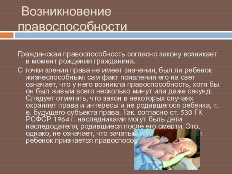 точки зрения права не имеет значения, был ли ребенок жизнеспособным: сам факт появления его на свет означает, что у него возникла правоспособность, хотя бы он был живым всего несколько минут или даже секунд. Следует отметить, что закон в некоторых случаях охраняет права и интересы и не родившегося ребенка, т.е. будущего субъекта права. Так. согласно ст. 530 ГК РСФСР 1964 г. наследниками могут быть дети наследодателя, родившиеся после его смерти. Это, однако, не означает, что зачатый, но не родившийся ребенок признается правоспособным.