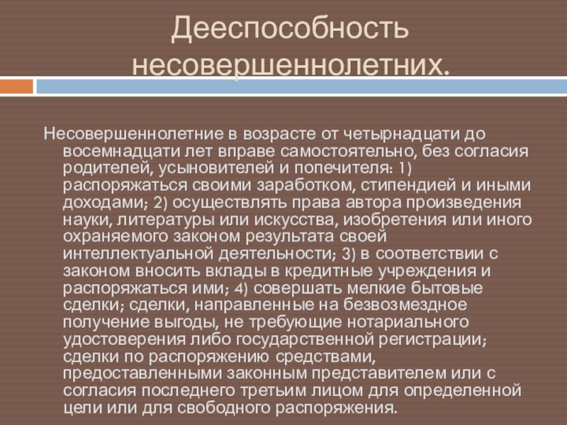 без согласия родителей, усыновителей и попечителя: 1) распоряжаться своими заработком, стипендией и иными доходами; 2) осуществлять права автора произведения науки, литературы или искусства, изобретения или иного охраняемого законом результата своей интеллектуальной деятельности; 3) в соответствии с законом вносить вклады в кредитные учреждения и распоряжаться ими; 4) совершать мелкие бытовые сделки; сделки, направленные на безвозмездное получение выгоды, не требующие нотариального удостоверения либо государственной регистрации; сделки по распоряжению средствами, предоставленными законным представителем или с согласия последнего третьим лицом для определенной цели или для свободного распоряжения.