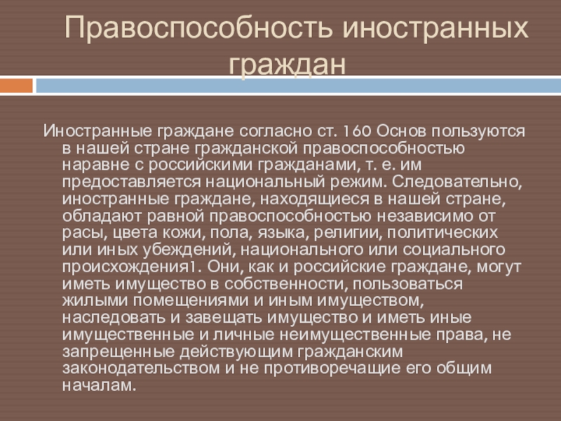 граждане согласно ст. 160 Основ пользуются в нашей стране гражданской правоспособностью наравне с российскими гражданами, т. е. им предоставляется национальный режим. Следовательно, иностранные граждане, находящиеся в нашей стране, обладают равной правоспособностью независимо от расы, цвета кожи, пола, языка, религии, политических или иных убеждений, национального или социального происхождения1. Они, как и российские граждане, могут иметь имущество в собственности, пользоваться жилыми помещениями и иным имуществом, наследовать и завещать имущество и иметь иные имущественные и личные неимущественные права, не запрещенные действующим гражданским законодательством и не противоречащие его общим началам.