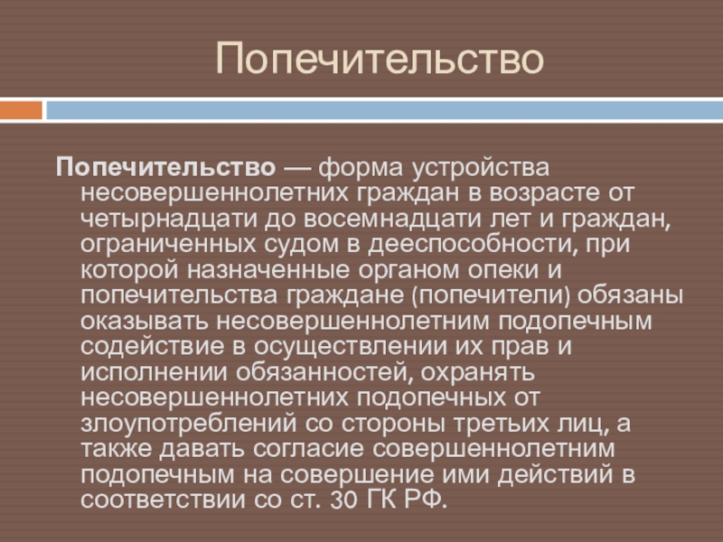 несовершеннолетних граждан в возрасте от четырнадцати до восемнадцати лет и граждан, ограниченных судом в дееспособности, при которой назначенные органом опеки и попечительства граждане (попечители) обязаны оказывать несовершеннолетним подопечным содействие в осуществлении их прав и исполнении обязанностей, охранять несовершеннолетних подопечных от злоупотреблений со стороны третьих лиц, а также давать согласие совершеннолетним подопечным на совершение ими действий в соответствии со ст. 30 ГК РФ.