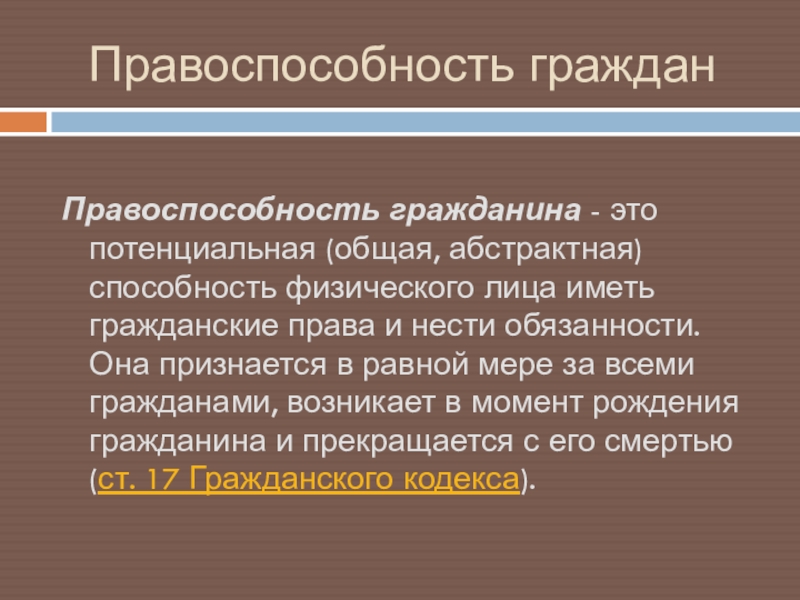 Правоспособность гражданина - это потенциальная (общая, абстрактная) способность физического