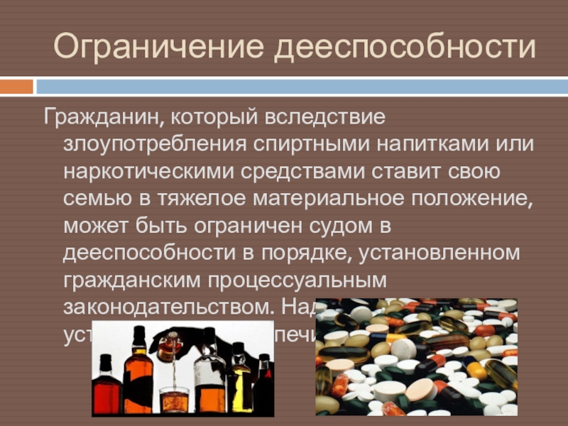 ставит свою семью в тяжелое материальное положение, может быть ограничен судом в дееспособности в порядке, установленном гражданским процессуальным законодательством. Над ним устанавливается попечительство.