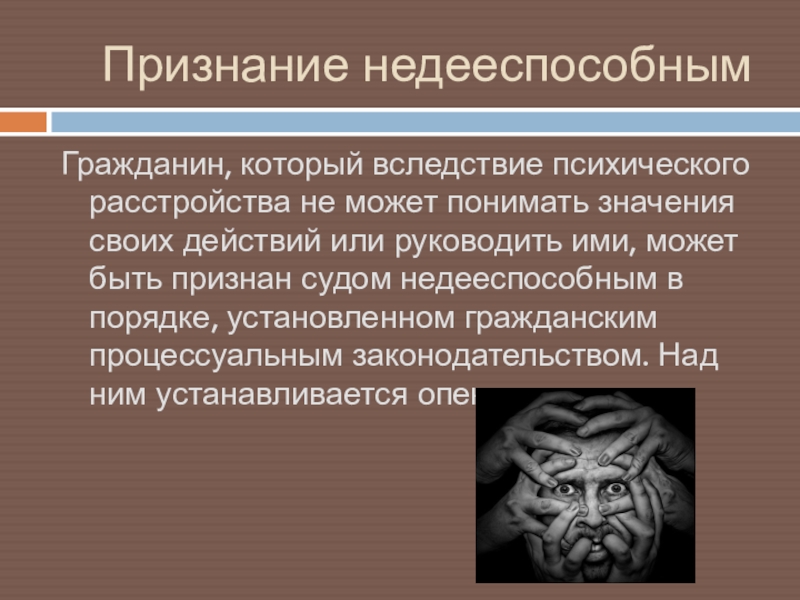 значения своих действий или руководить ими, может быть признан судом недееспособным в порядке, установленном гражданским процессуальным законодательством. Над ним устанавливается опека.