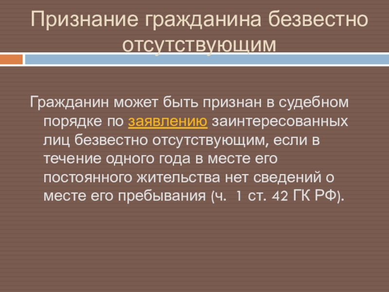 заявлению заинтересованных лиц безвестно отсутствующим, если в течение одного года в месте его постоянного жительства нет сведений о месте его пребывания (ч. 1 ст. 42 ГК РФ).