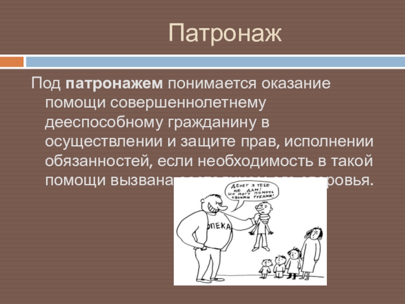 патронажем понимается оказание помощи совершеннолетнему дееспособному гражданину в осуществлении и защите прав, исполнении обязанностей, если необходимость в такой помощи вызвана состоянием его здоровья.