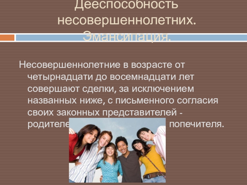 Слайд 14Дееспособность несовершеннолетних. Эмансипация.