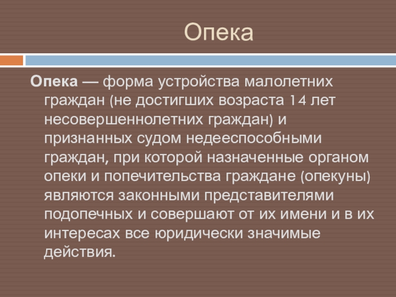 Опека — форма устройства малолетних граждан (не достигших возраста 14 лет несовершеннолетних граждан) и признанных судом недееспособными граждан, при которой назначенные органом опеки и попечительства граждане (опекуны) являются законными представителями подопечных и совершают от их имени и в их интересах все юридически значимые действия.