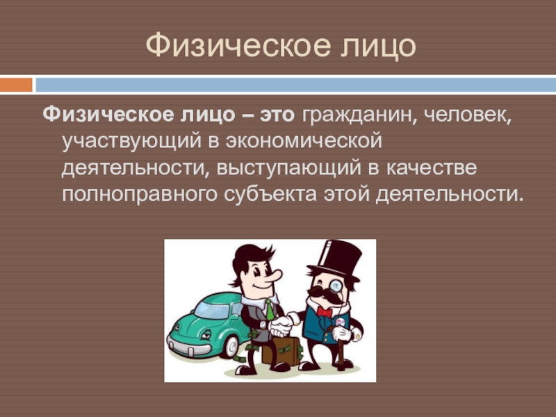 Физическое лицо – это индивидуальные бизнесмены или коммерсанты, осуществляющие различные хозяйственные операции в разных сферах деятельности - производственной, торговой, транспортной, банковской, биржевой и т. д.