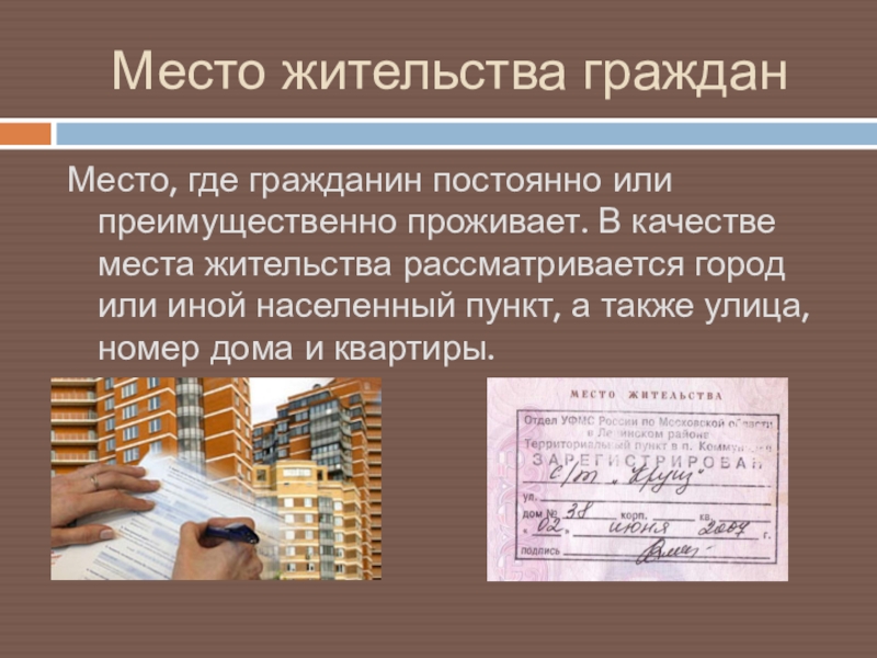 В качестве места жительства рассматривается город или иной населенный пункт, а также улица, номер дома и квартиры.