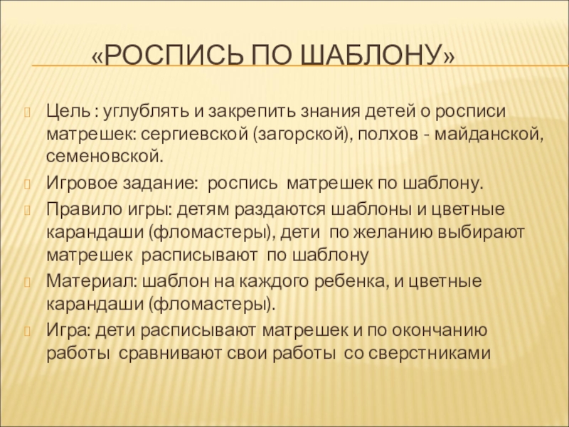 Правило игры: детям раздаются шаблоны и цветные карандаши (фломастеры), дети по желанию выбирают матрешек расписывают по шаблону