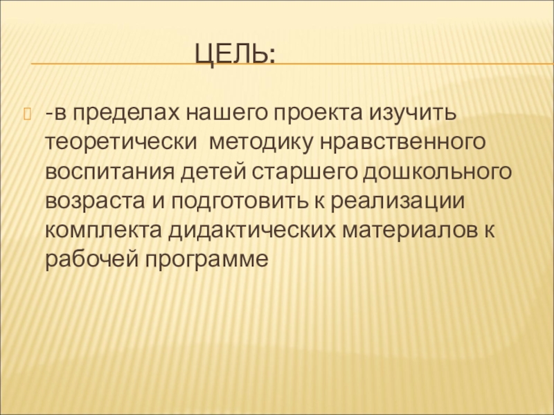 -в пределах нашего проекта изучить теоретически методику нравственного воспитания детей старшего дошкольного возраста и подготовить к реализации комплекта дидактических материалов к рабочей программе