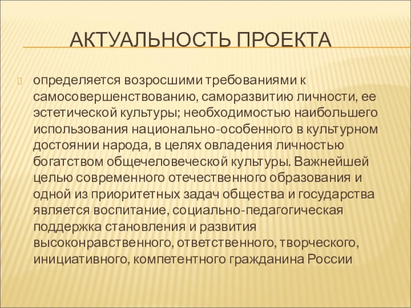 к самосовершенствованию, саморазвитию личности, ее эстетической культуры; необходимостью наибольшего использования национально-особенного в культурном достоянии народа, в целях овладения личностью богатством общечеловеческой культуры. Важнейшей целью современного отечественного образования и одной из приоритетных задач общества и государства является воспитание, социально-педагогическая поддержка становления и развития высоконравственного, ответственного, творческого, инициативного, компетентного гражданина России
