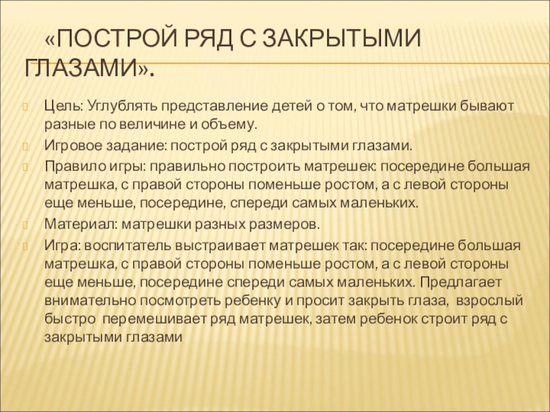Игра: воспитатель выстраивает матрешек так: посередине большая матрешка, с правой стороны поменьше ростом, а с левой стороны еще меньше, посередине спереди самых маленьких. Предлагает внимательно посмотреть ребенку и просит закрыть глаза, взрослый быстро перемешивает ряд матрешек, затем ребенок строит ряд с закрытыми глазами