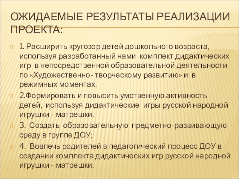 4. Вовлечь родителей в педагогический процесс ДОУ в создании комплекта дидактических игр русской народной игрушки - матрешки.