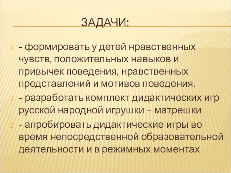 2.Формировать и повысить умственную активность детей, используя дидактические игры русской народной игрушки - матрешки.