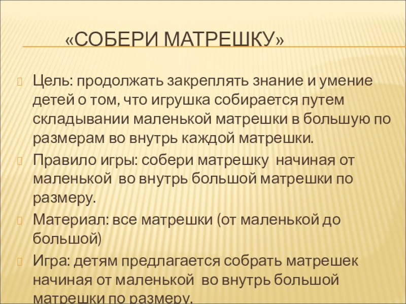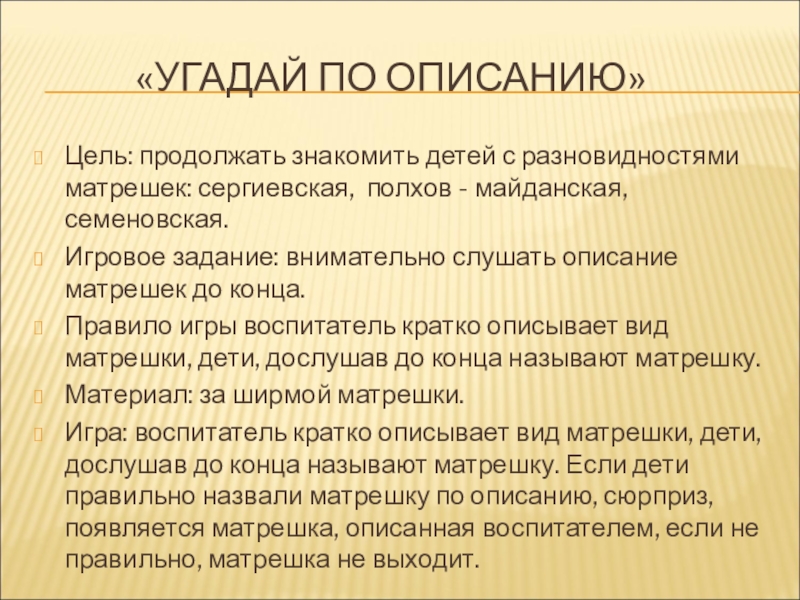 Правило игры воспитатель кратко описывает вид матрешки, дети, дослушав до конца называют матрешку.